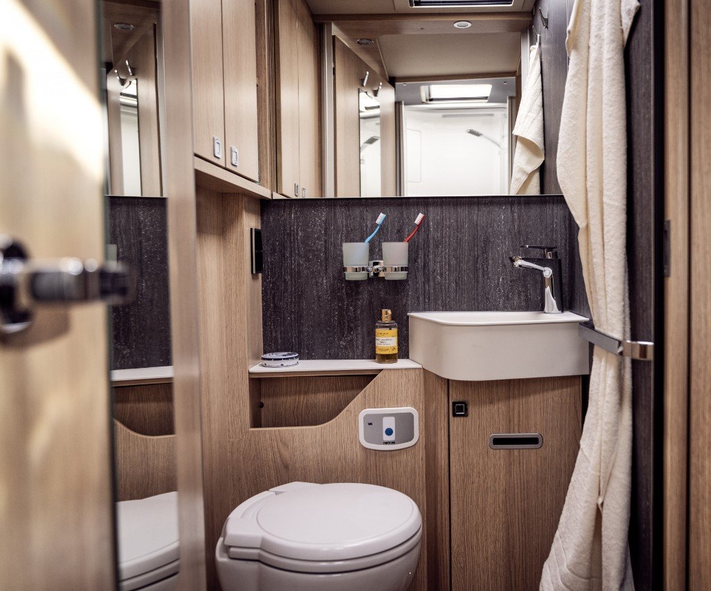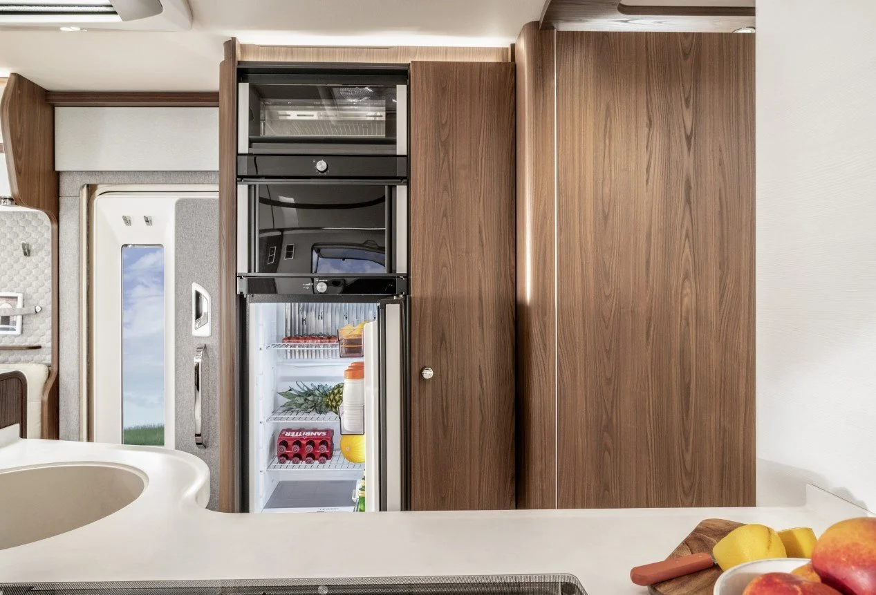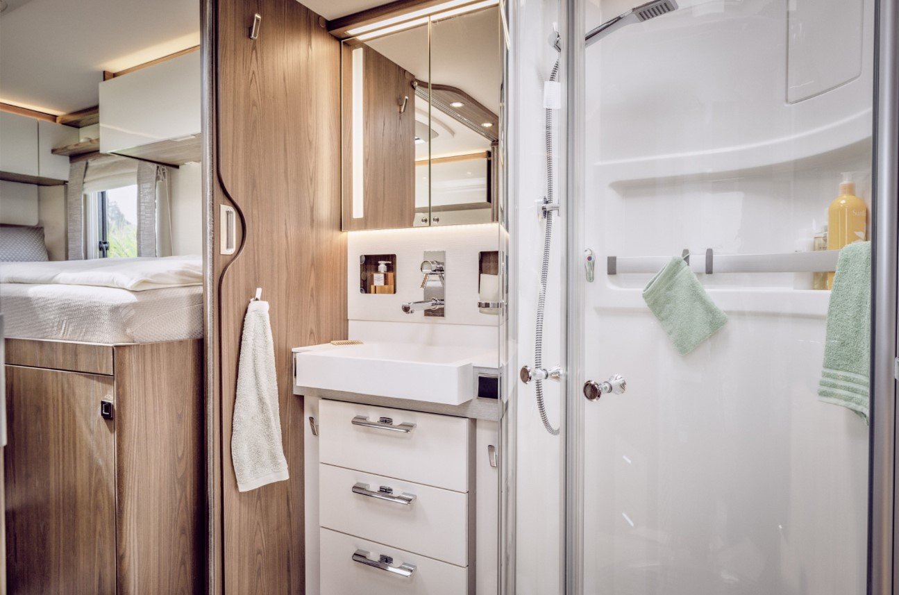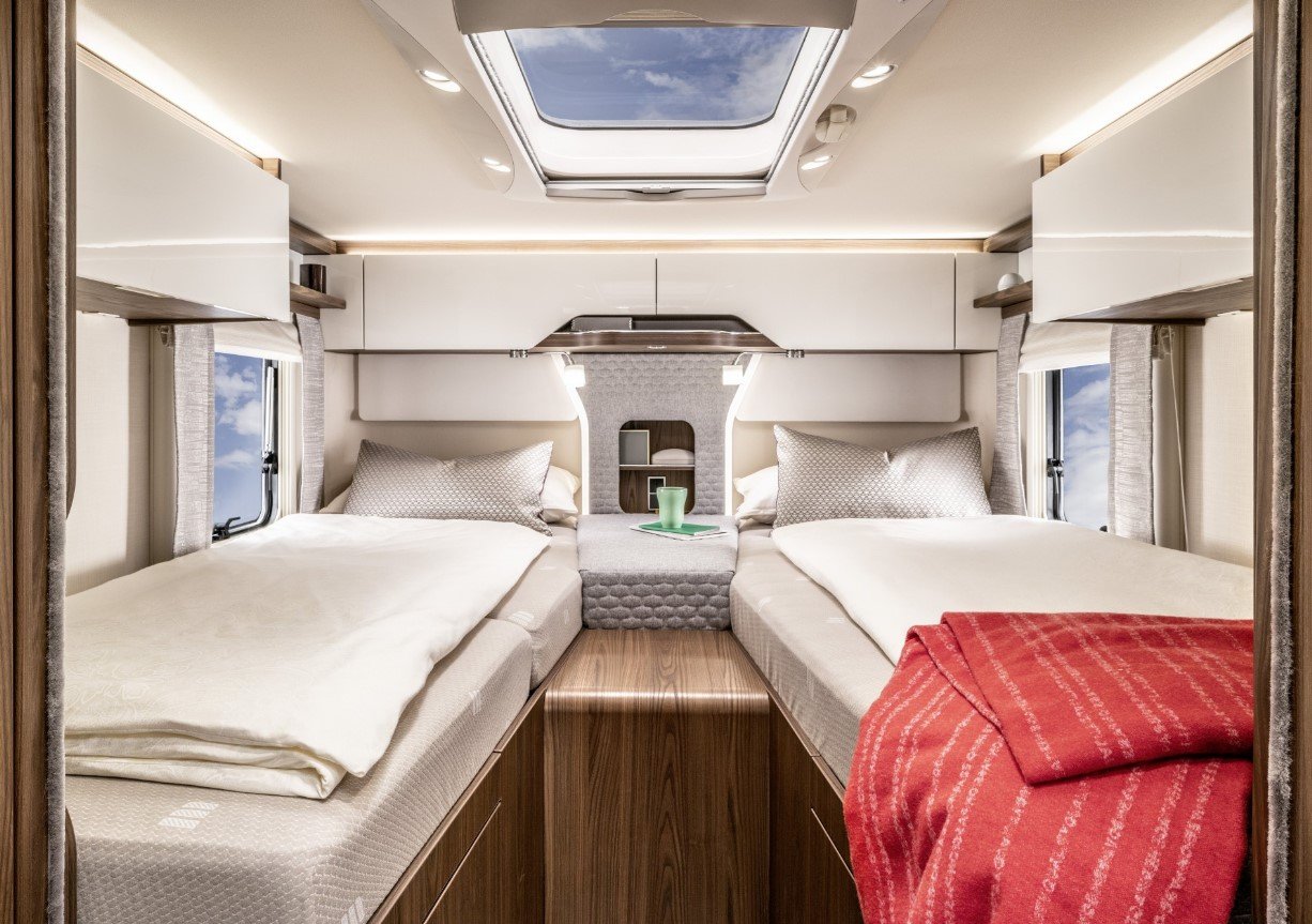 A felső kategóriában – például egy Hymer vagy egy Morelo modell esetében – valódi fa furnérokat, matt lakkozott felületeket, soft-close rendszereket, rétegzett hangulatvilágítást és gondosan megválasztott textíliákat találsz. A színpaletta általában neutrális: homok, kőszürke, törtfehér, meleg dió. És persze nem véletlenül, ugyanis kis térben a vizuális zaj azonnal nyomasztóvá válik.