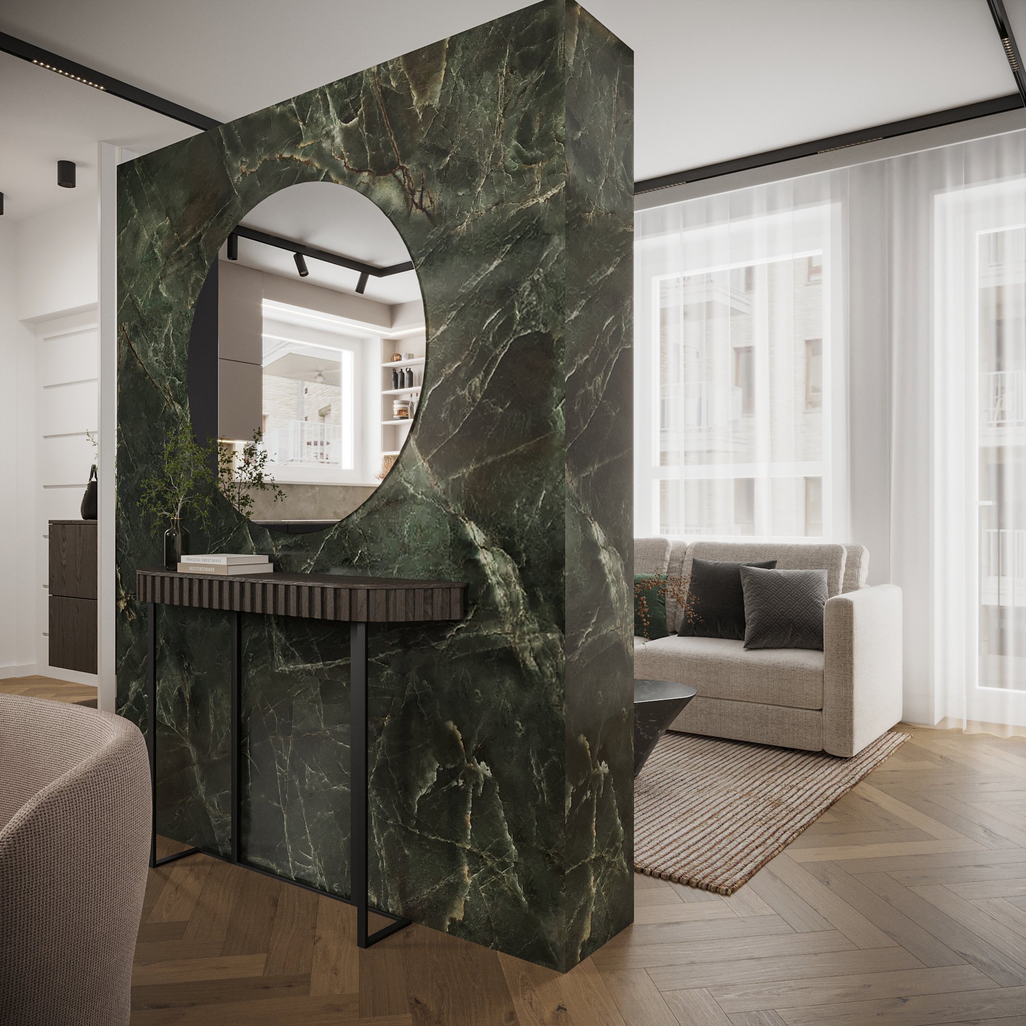 Ebbe a letisztult, mégis elegáns ingatlanba egy fiatal pár és kisfiúk költözik be néhány éves időszakra, amíg építkeznek. A 70 nm-es, II. kerületi lakás megtervezése során figyelembe kellett venni a házaspár színvilágban eltérő ízlését is: a feleség a nőies, világosabb bézs színek felé húzott, a férj pedig a sötétebb maszkulin színvilágot szerette volna érvényesíteni.